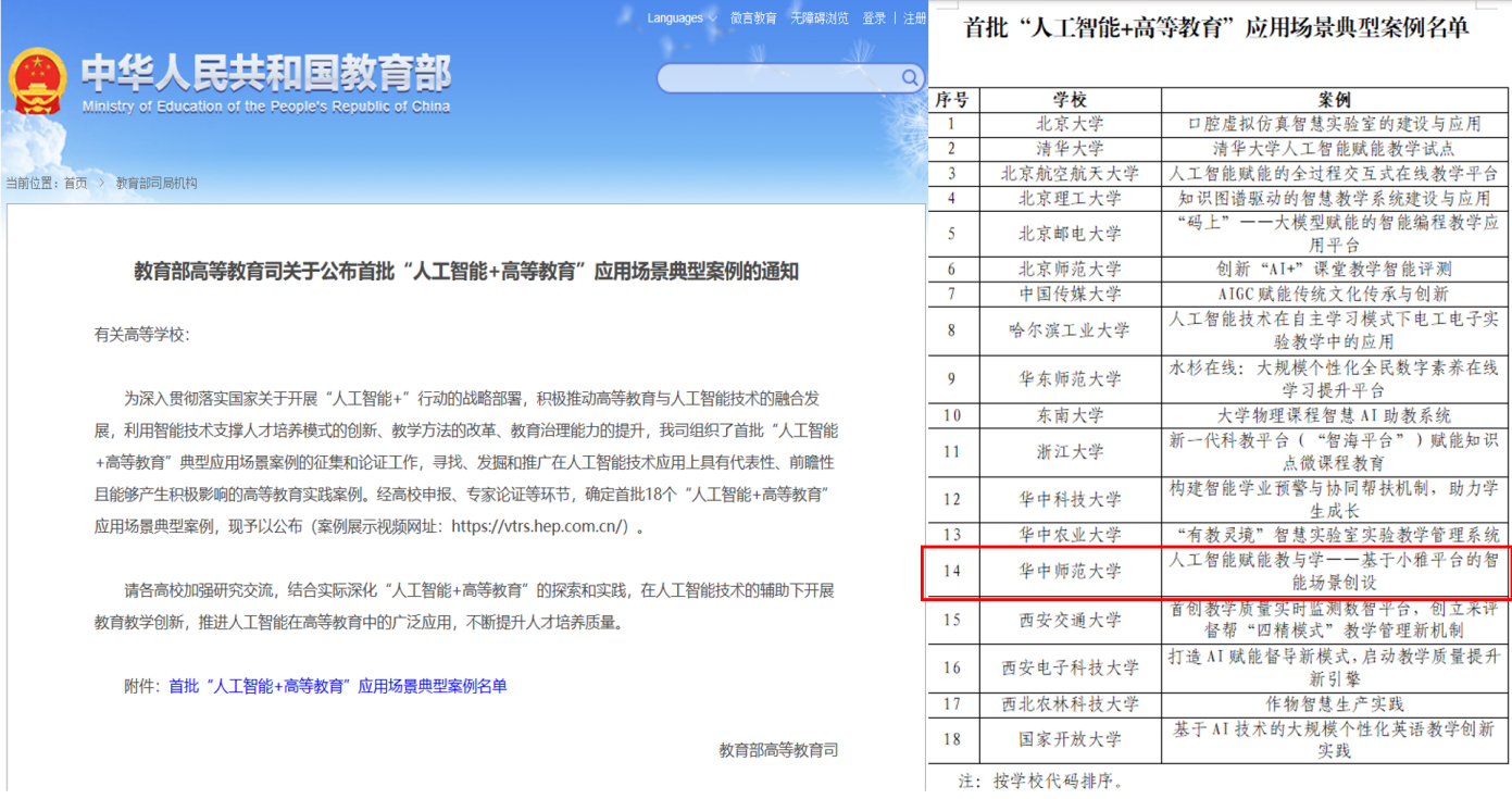 华大在线讯(通讯员 成雯)4月12日,教育部高教司公布了全国首批18个“人工智能+高等教育”应用场景典型案例,我校“人工智能赋能教与学——基于小雅平台的智能场景创设”成功入选。