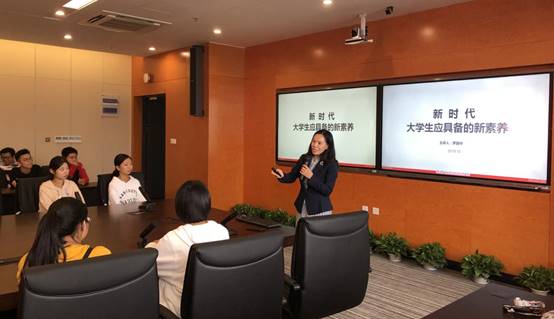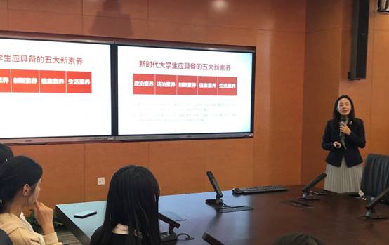 随后,结合党的十九大报告、全国教育大会精神和21世纪新的人才观,罗丽华书记提出“新时代大学生应具备五大新素养”——政治素养、法治素养、创新素养、信息素养和生活素养,从是什么、为什么、怎么做三方面逐一进行分析解读,希望同学们在大学四年中不仅能学到科学文化知识,更能提高自身综合素养。