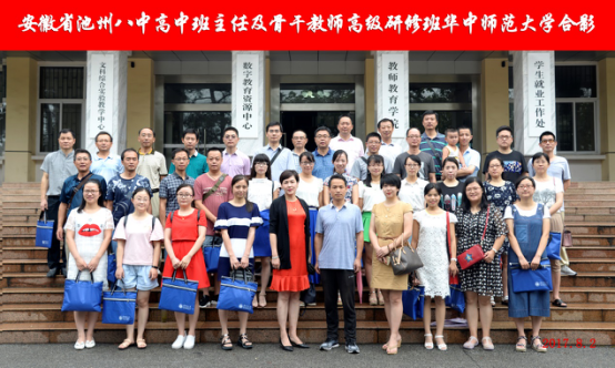2017年8月1日至6日,安徽省池州八中高中班主任及骨干教师高级研修班在华中师范大学成功举办。8月2日上午,本次研修班开班仪式在华中师范大学教师教育学院B504教室举行,安徽池州八中校办室主任王睿、安徽池州八中教导副主任曹君、安徽池州八中教导副主任汪跃进、华中师范大学职业与继续教育学院培训部主任杜芳出席了开班仪式。