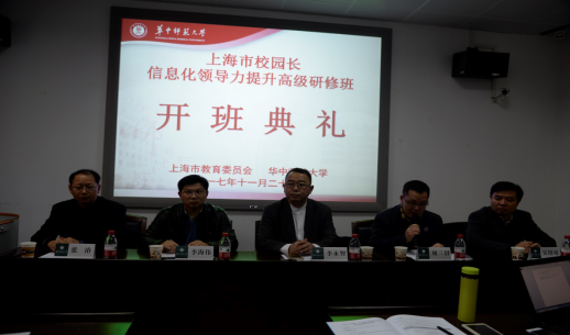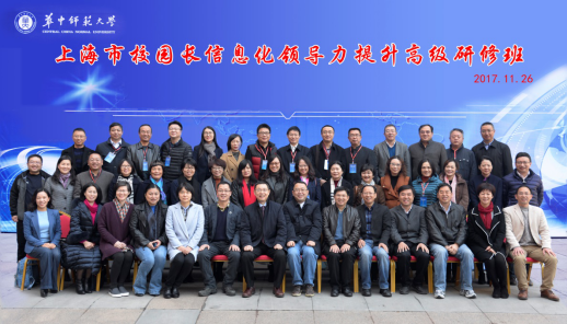 2017年11月25日至11月29日,上海市中小学、幼儿园校长教育信息化领导力提升高级研修班培训在华中师范大学成功举办。11月25日上午,本次研修班开班仪式在华中师范大学管理教育综合楼208室举行,上海市教育委员会副主任李永智、上海市教育委员会信息化办公室主任李海伟、上海市电化教育馆馆长张治、华中师范大学国家数字化学习工程技术研究中心常务副主任刘三女牙、国家数字化学习工程技术研究中心副主任吴绍靖等出席了开班典礼,学员由来自上海市中小学校长、幼儿园园长、信息化分管领导组成。