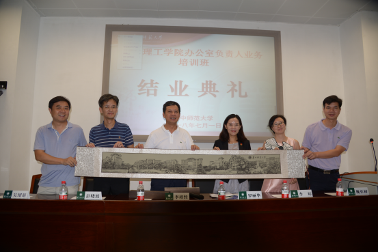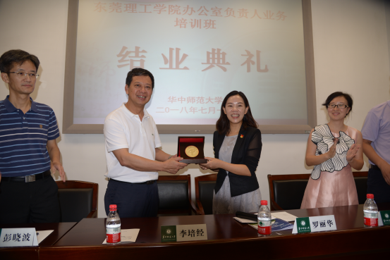 2018年6月28日至7月1日,东莞理工学院办公室负责人业务培训班在华中师范大学成功举办。7月1日上午,本次研修班在华中师范大学教育管理综合楼202报告厅圆满结束。出席结业典礼的领导有,华中师范大学国家数字化学习工程技术研究中心党委书记罗丽华,副主任吴绍靖,东莞理工学院党委委员、党委组织部部长李培经,学校办公室(党委办公室)主任彭晓波,教师发展中心主任、人事处副处长李环,学校办公室(党委办公室)副主任魏东初,学校办公室(党委办公室)副主任王博,以及全体培训班成员。东莞理工学院学校办公室(党委办公室)副主任王博主持结业典礼,华中师范大学国家数字化学习工程技术研究中心党委书记罗丽华为学员颁发结业证书。在结业典礼上,双方代表互送纪念品以示两校友谊长存。会后,两校领导与学员合影留念。
