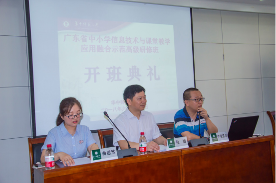 2018年6月24日至7月1日,广东省中小学信息技术与课堂教学应用融合示范培训班在华中师范大学成功举办。6月25日上午,本次研修班开班仪式在华中师范大学科学会堂201举行,华中师范大学国家数字化学习工程技术研究中心主任助理杜旭出席了开班仪式。