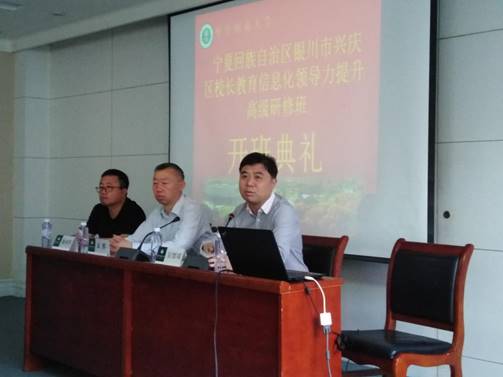 2019年5月19日至5月24日,宁夏回族自治区银川市兴庆区校长教育信息化领导力提升高级研修班在华中师范大学成功举办。5月20日上午,本次研修班开班仪式在华中师范大学科学会堂201举行,银川市兴庆区教育局副局长袁辉、银川市兴庆区教育局信息技术负责人仇向军、国家数字化学习工程技术研究中心副主任吴绍靖出席了开班仪式。