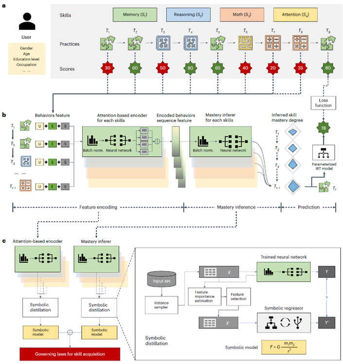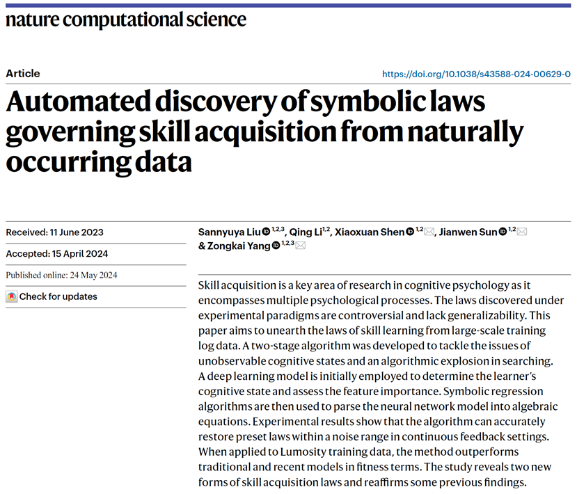 (通讯员 孙建文)近日,人工智能教育学部刘三女牙教授团队取得阶段性研究进展,提出了一种新颖的学习规律挖掘方法,能够从自然发生的大规模行为数据中揭示认知技能习得的规律,为教育科学研究提供了一种高效的、更具潜力的研究工具。相关成果“Automated discovery of symbolic laws governing skill acquisition from naturally occurring data”在Nature子刊《自然-计算科学》(Nature Computational Science)在线发表。
