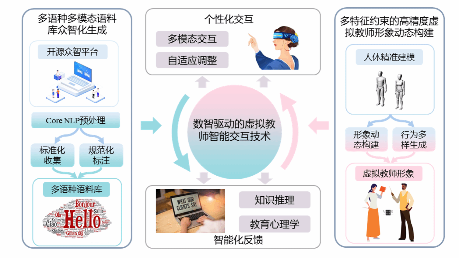 课题针对我国外交和商务的小语种人才及教学资源缺失、场景化学习环境构建难等核心问题,围绕多语种多模态语料库众智化生成与虚拟教师智能交互的关键技术开展攻关。具体包括构建多语种多模态语料库标准体系,实现多语种多模态语料库众智化生成;研究融合几何与外观特征的高精度人体动态建模技术,构建高精度虚拟教师形象;研究数智驱动的虚拟教师智能交互技术,动态响应学习者个性化需求。通过突破上述关键技术,为外交与商务场景的小语种智慧教学提供关键支撑,推动我国小语种人才培养的智能化进程。