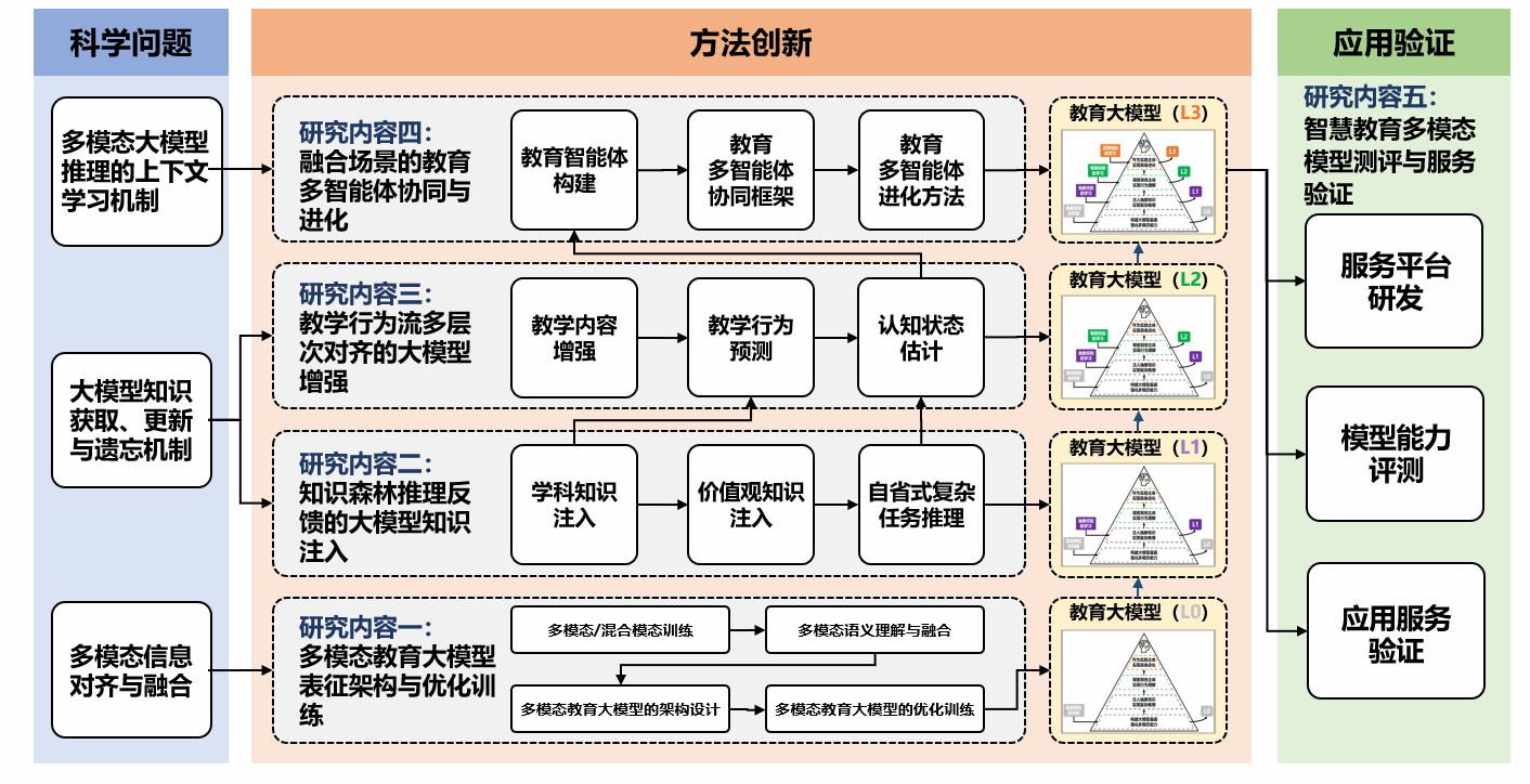 项目聚焦智慧教育模型能力提升和智慧教育服务模式整合两项现实需求,重点研究多模态教育大模型表征架构与优化方法、知识森林推理反馈的大模型知识注入、教学行为流多层次对齐的大模型增强、融合场景的教育智能体协同与进化、智慧教育多模态模型测评与服务验证五个课题,旨在打造“1+M”智慧教育模型新形态和“1+M+N”智慧教育服务新模式。