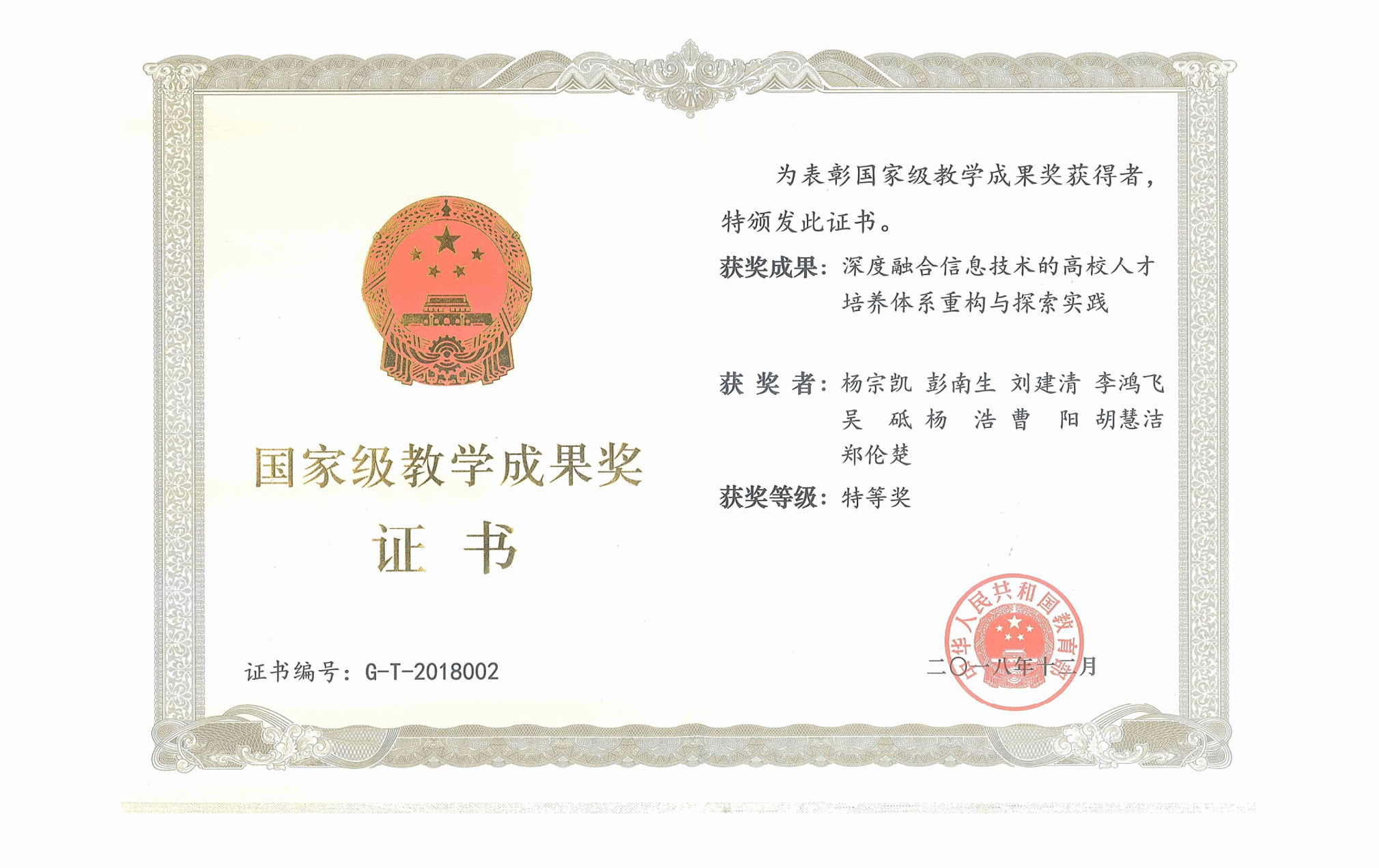 1994年国务院发布《教学成果奖励条例》,在高等学校中正式确立了由国家法规所确定的与科技“三项奖”所并行的国家级教学成果奖励制度。高等教育国家级教学成果奖是国家在教学研究和实践领域中颁授的最高奖项,每4年评审一次,体现了国家对高等学校教学工作的高度重视,展现了高等学校在教学建设、教学改革、人才培养等方面所取得的成绩。其中,特等奖是最高奖,每届只有2项,竞争非常激烈。2018年,国家级教学成果奖的申报和评选工作如期开展,我校以“深度融合信息技术的高校人才培养体系重构与探索实践”为主题,成功获评高等教育国家级教学成果特等奖。这是在教育技术学科发挥主干牵引作用的情况下,高等学校获得的第一个国家级教学成果特等奖。